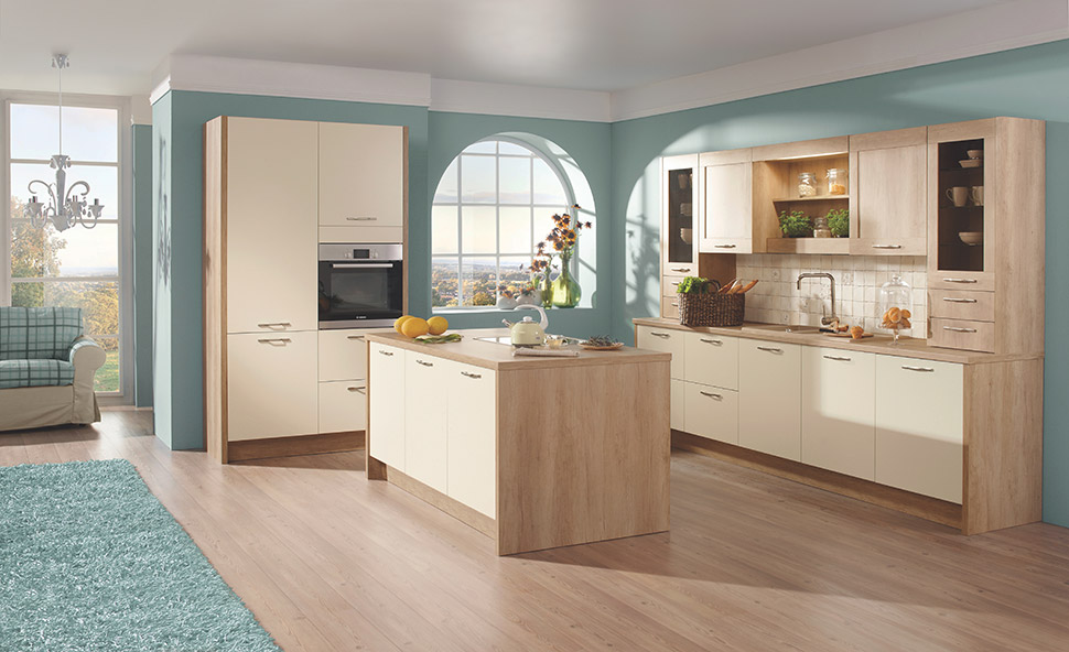 NAREJENO Z OBČUTKOM SVOBODE podeželja. Idealna kombinacija naravnega hrasta in laka v barvi magnolije zagotavlja trdnost in odločnost na eni strani ter nežnost na drugi strani.