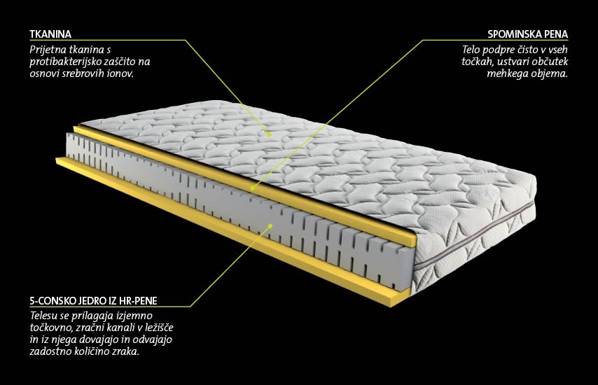 Jogi ležišče Monsun je ležišče z jedrom iz visoko-elastične hladno valjane (HR) pene, ki ima prečno tanke, različno globoke zareze. Zareze so razporejene tako, da ima ležišče 5 con. Skozi zareze se v ležišče in iz njega dovajajo in odvajajo zadostne količine zraka kar preprečuje pregrevanje telesa. Osrednji del ležišča je obložen z 2-centimetrsko plastjo spominske pene, ta telo podpre čisto v vseh točkah in ustvari občutek mehkega objema. Jogi ležišče Monsun spada med ležišča z normalno trdoto.